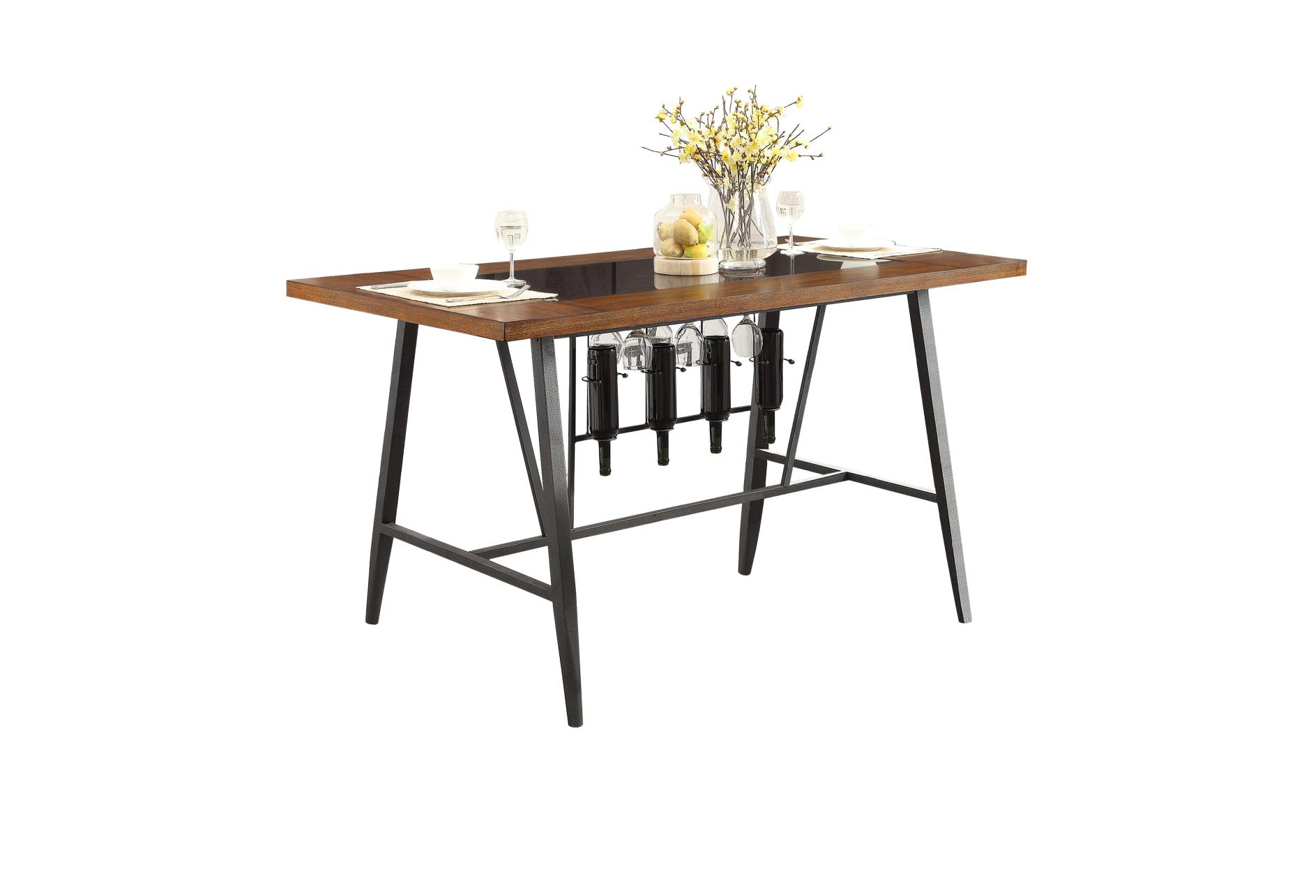 Transitional lines paired with mixed media elements create the casual look of the Selbyville Collection. The fixed wood top of the group features a rectangular black glass insert that allows you to look down onto the under-table wine storage rack. Metal framing supports the table and wood seat swivel chairs. The cherry finish of the wood is accented by the Gunmetal finished metal.
