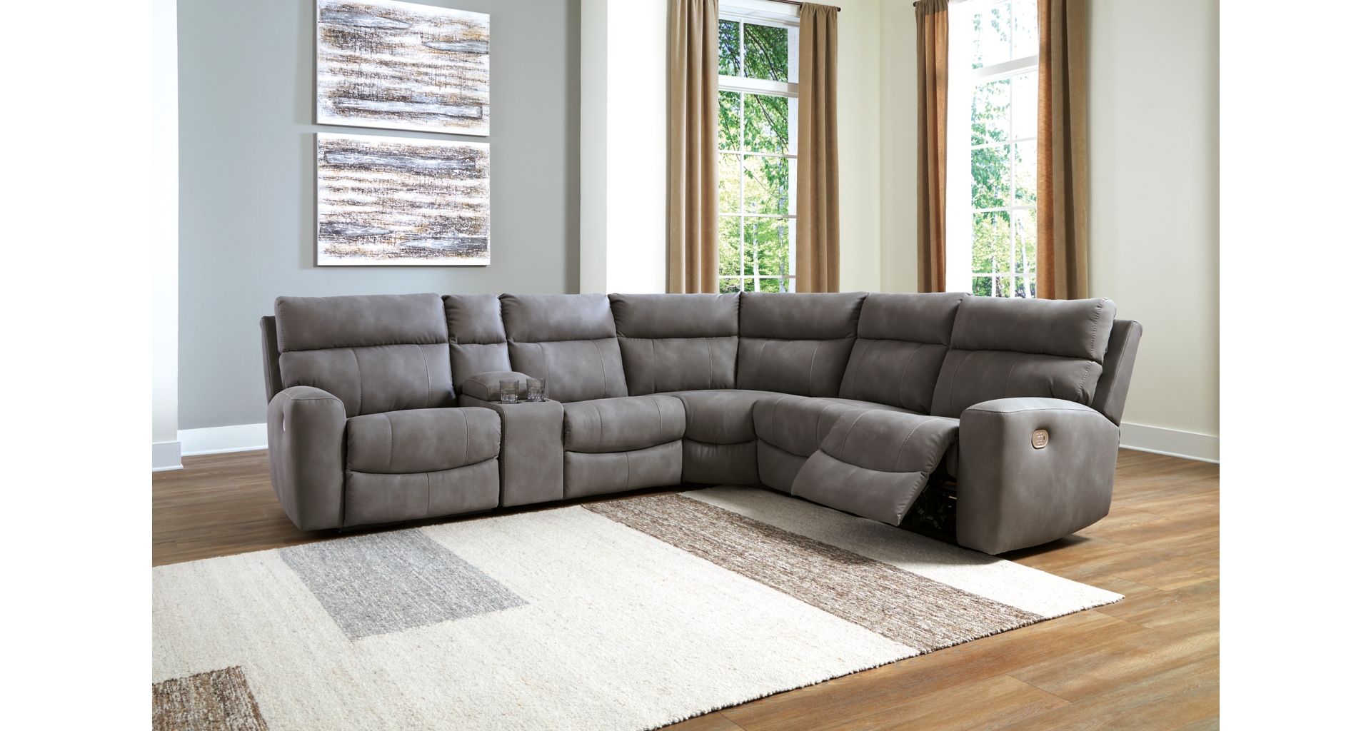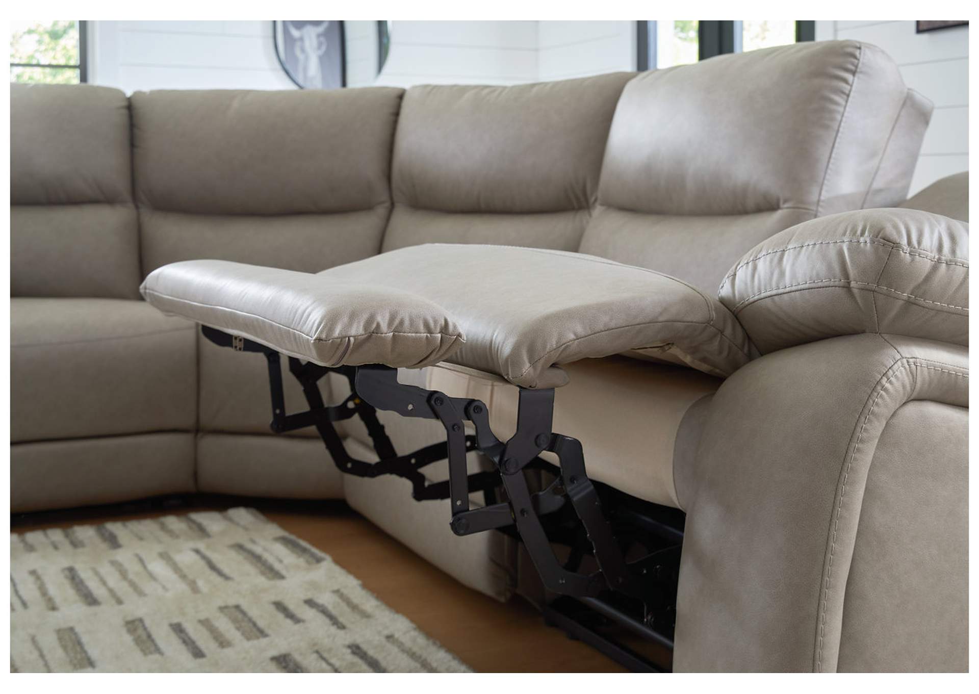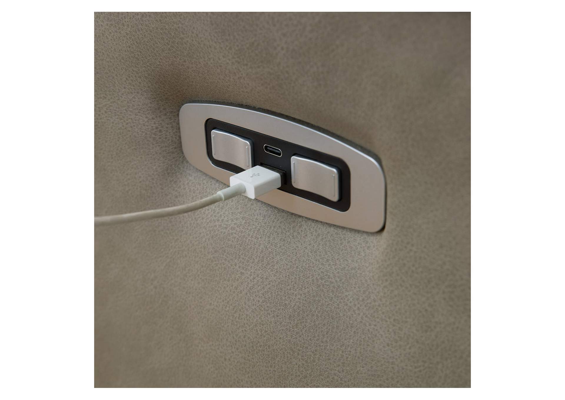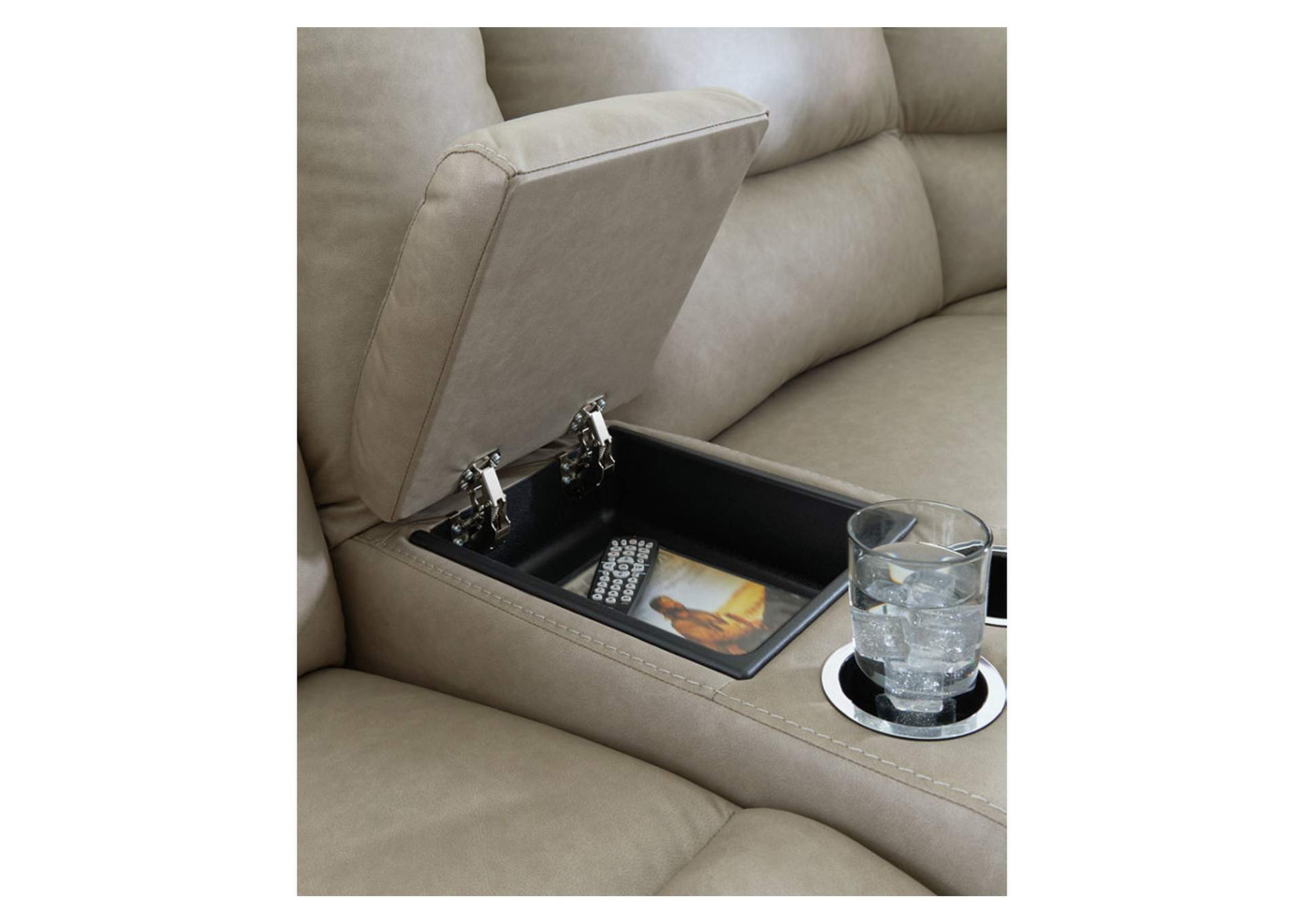 Experience ultimate comfort with this power reclining sectional. Generously cushioned with plush bustle back styling and pillow top track arms, it’s wrapped in a richly neutral upholstery that’s oh-so soft. Jumbo stitching gives the sectional added definition. The one-touch power control and USB charging take the pleasure of reclining to a higher level, while a console with storage and dual cup holders marries function with great form.