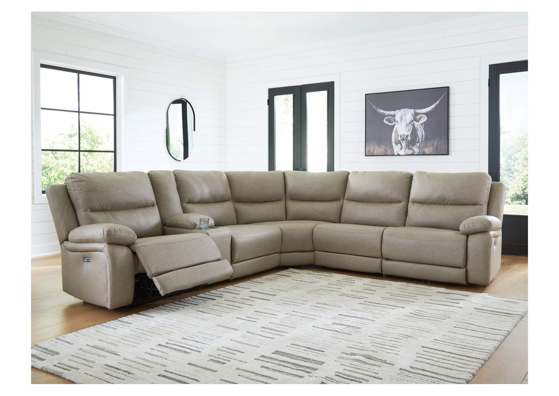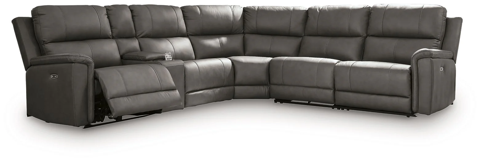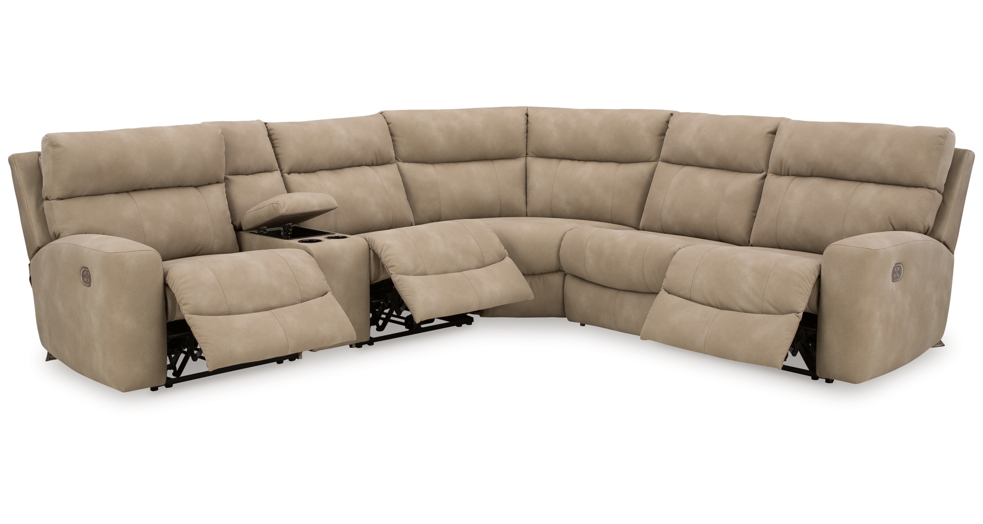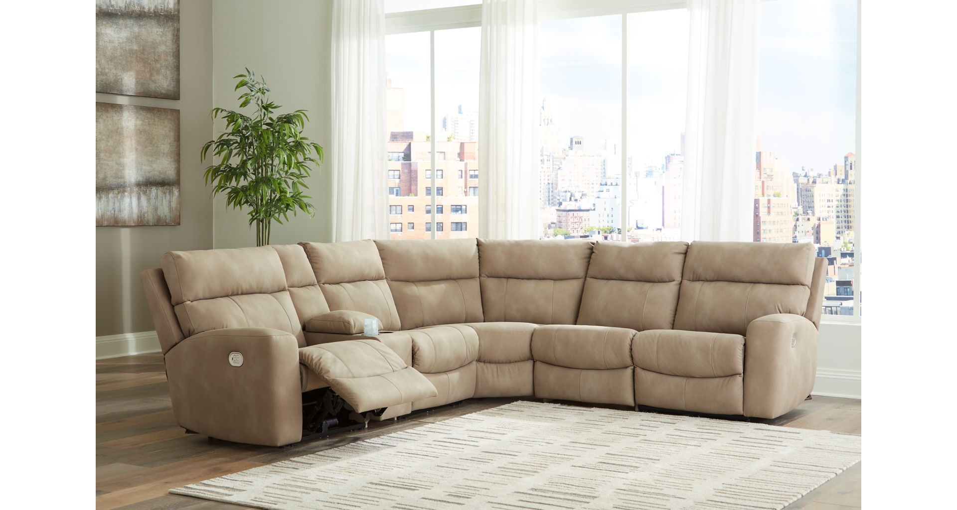 Experience ultimate comfort with this power reclining sectional. Generously cushioned with plush bustle back styling and pillow top track arms, it’s wrapped in a richly neutral upholstery that’s oh-so soft. Jumbo stitching gives the sectional added definition. The one-touch power control and USB charging take the pleasure of reclining to a higher level, while a console with storage and dual cup holders marries function with great form.