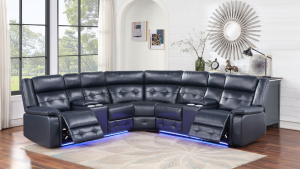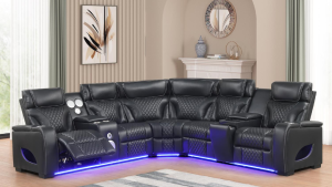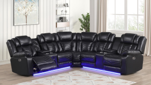 | SPL S404 | Reese – Sectional (Black), Gel Leather, Black With : Power Recliner, Power Headrest, Console, Bluetooth Speaker, SS Cup Holder, USB Switch, Storage Armrest, LED Light Each | 110 x 110 x 39 H |