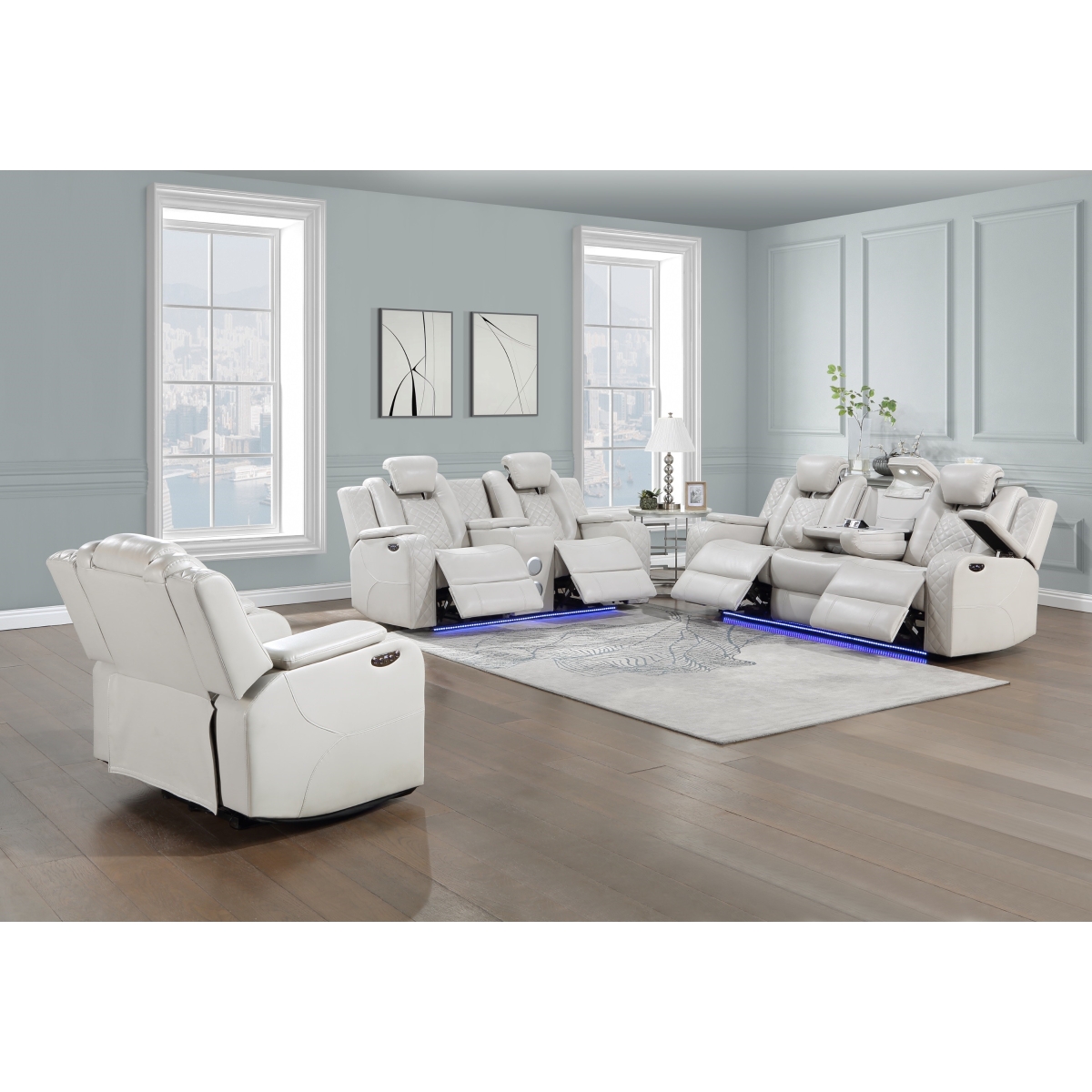• Ambient blue LED lighting for a theater-style experience